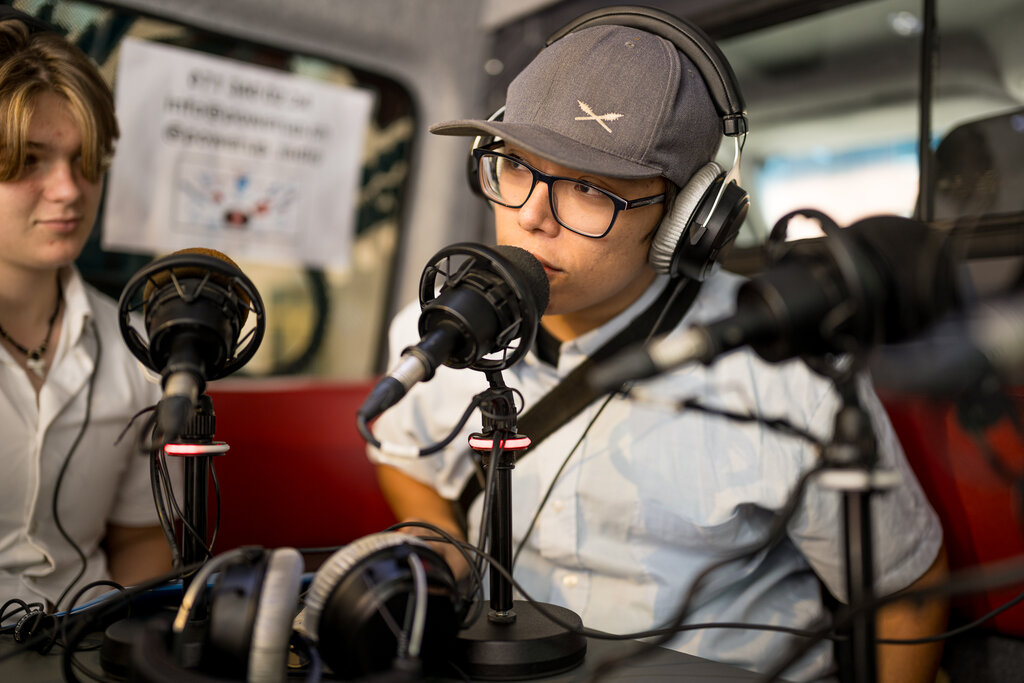ZG: Musikschule Risch: Schüler:innen der Schule und der Musikschule Risch senden aus dem Radiobus auf dem Dorfmattplatz in Rotkreuz, 16. September 2025